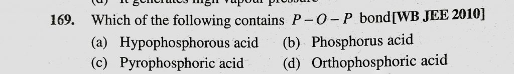 Which of the following contains P-O-P bond (a) Hypophosphorous acid (b) Phosphorus acid (c) Pyrophosphoric acid Which of the following contains P-O-P bond (a) Hypophosphorous acid (b) Phosphorus acid (c) Pyrophosphoric acid November 23, 2020 Category: Uncategorised (JEE Advanced Physics by BM Sharma + GMP Solutions) , Facebook Messenger WhatsApp Share this:TwitterFacebook Related