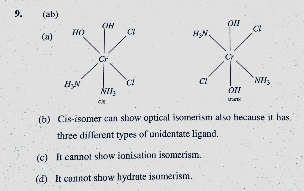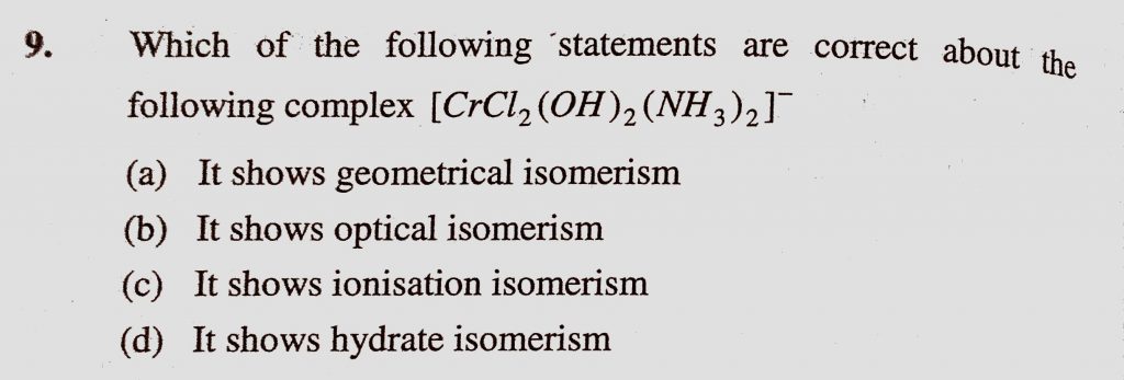 Which of the following statements are correct about the following complex (CrCl2(OH)2 (NH3)2) – (a) It shows geometrical isomerism Which of the following statements are correct about the following complex (CrCl2(OH)2 (NH3)2) - (a) It shows geometrical isomerism December 6, 2020 Category: Uncategorised (JEE Advanced Physics by BM Sharma + GMP Solutions) , Facebook Messenger WhatsApp Share this:TwitterFacebook Related
