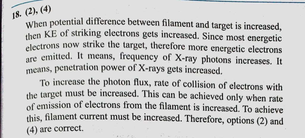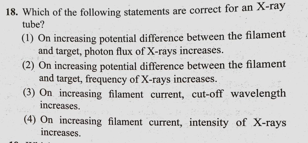 Which of the following statements are correct for an X-ray tube ? (1) On increasing potential difference between the filament and target, photon flux of X-rays increases. (2) On increasing photon flux of X-rays increases. (2) On increasing Which of the following statements are correct for an X-ray tube ? (1) On increasing potential difference between the filament and target October 16, 2020 Category: Uncategorised (JEE Advanced Physics by BM Sharma + GMP Solutions) , Facebook Messenger WhatsApp Share this:TwitterFacebook Related