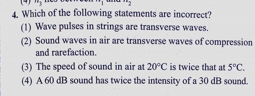 Which of the following statements are incorrect ? (1) Wave pulses in strings are transverse waves. (2) Sound waves in air are transverse waves of compression and rarefaction. Which of the following statements are incorrect ? (1) Wave pulses in strings are transverse waves. (2) Sound waves in air are transverse waves of compression and rarefaction. November 8, 2020 Category: Uncategorised (JEE Advanced Physics by BM Sharma + GMP Solutions) , Facebook Messenger WhatsApp Share this:TwitterFacebook Related
