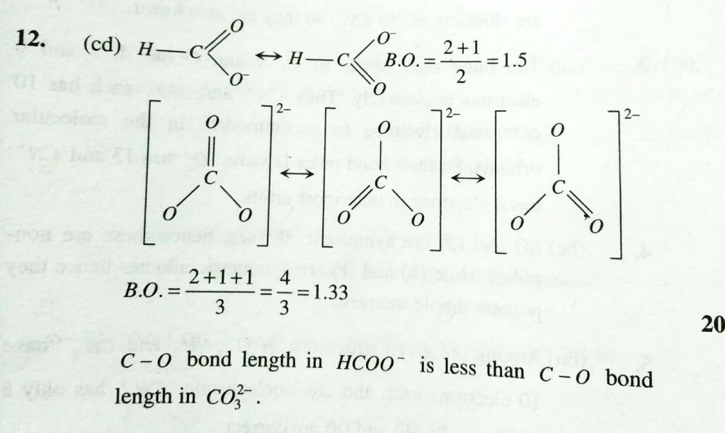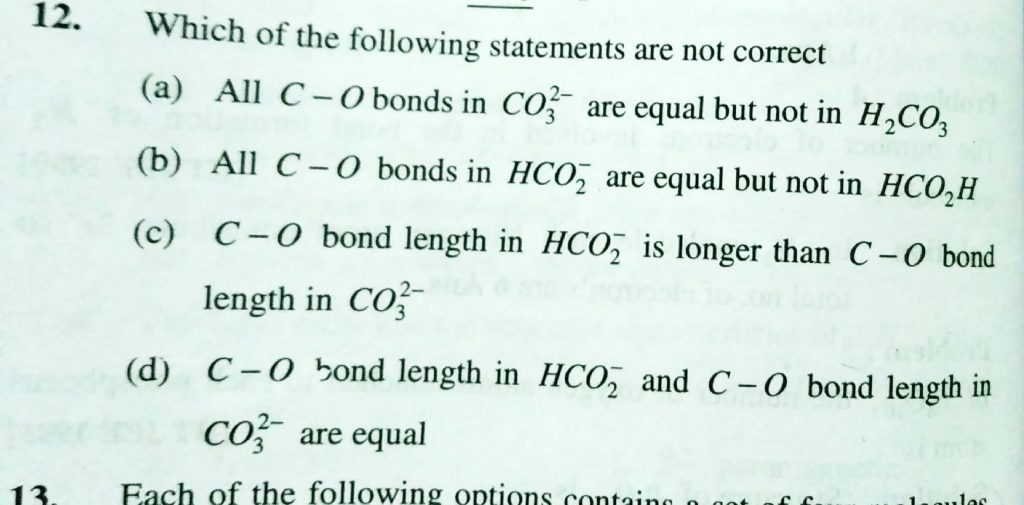 Which of the following statements are not correct (a) All C – O bonds in CO3^2- are equal but not is H2CO3 (b) All C – O bonds in HCO2^- are equal nut not in HCO2H (c) C – O bond length in HCO2^- is longer than C -O bond length in CO3^2- (d) C -O bond length in HCO2^- and C -O bond length in CO3^2- are equal