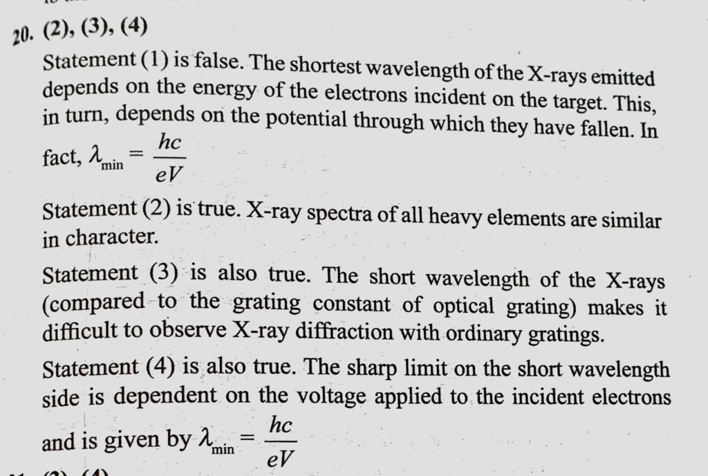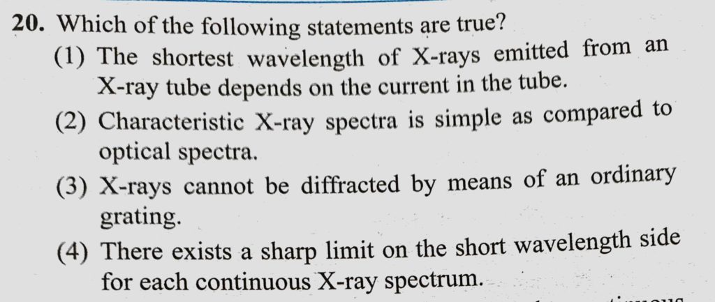 Which of the following statements are true? (1) The shortest wavelength of X-rays emitted from an X-ray tube depends on the current in the tube. (2) Characteristic X-ray spectra is simple as compared Which of the following statements are true? (1) The shortest wavelength of X-rays emitted from an X-ray tube depends on the current in the tube. (2) Characteristic X-ray spectra is simple as compared October 16, 2020 Category: Uncategorised (JEE Advanced Physics by BM Sharma + GMP Solutions) , Facebook Messenger WhatsApp Share this:TwitterFacebook Related