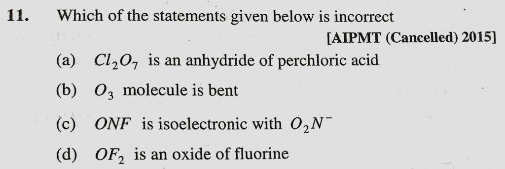 Which of the following statements given below is incorrect (a) Cl2O7 is an anhydride of perchloric acid (b) O3 molecule is bent Which of the following statements given below is incorrect (a) Cl2O7 is an anhydride of perchloric acid (b) O3 molecule is bent November 23, 2020 Category: Uncategorised (JEE Advanced Physics by BM Sharma + GMP Solutions) , Facebook Messenger WhatsApp Share this:TwitterFacebook Related