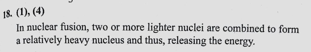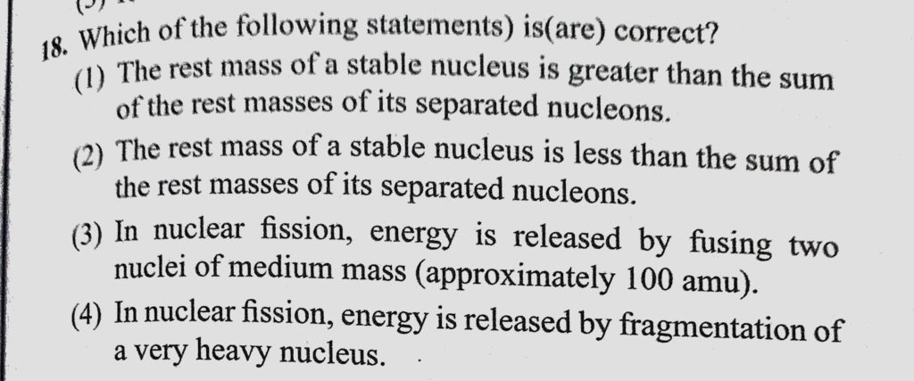 Which of the following statements is (are) correct ? (1) The rest mass of a stable nucleus is greater than the sum of the rest masses of its separated nucleons. (2) The rest mass of a stable nucleus is less than the sum the correct statements vis-a-vis these phenomena are: The phenomenon of nuclear fission can be carried out both in a controlled and in an uncontrolled way. Out of the following October 18, 2020 Category: Uncategorised (JEE Advanced Physics by BM Sharma + GMP Solutions) , Facebook Messenger WhatsApp Share this:TwitterFacebook Related