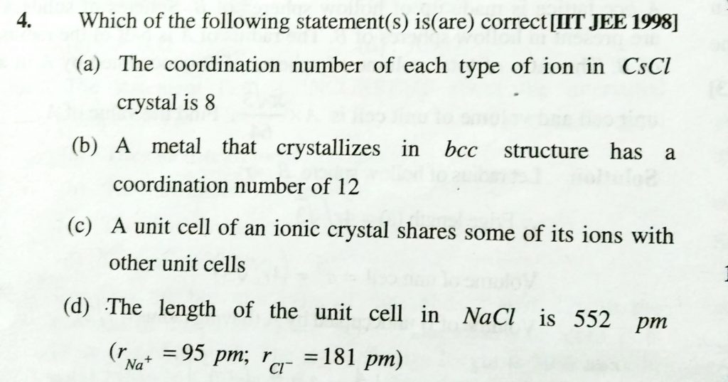 Which of the following statement(s) is (are) correct (a) The coordination number of each type of ion in CsCl crystal is 8 (b) Ametal that crystallizes in bcc structure has a coordintaion number of 12 (c) A unit cell of an ionic crystal shares some of its ions with other unit cells