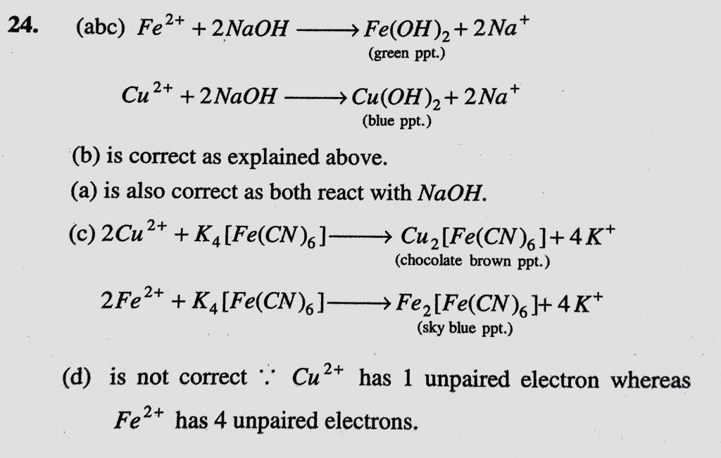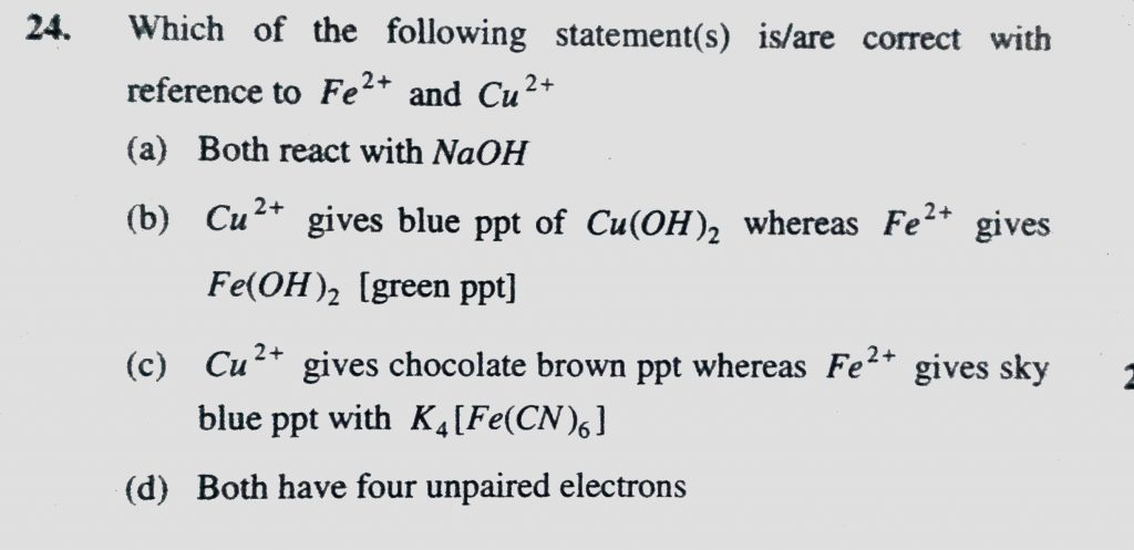 Which of the following statement(s) is/are correct with reference to Fe 2+ and Cu 2+ (a) Both react with NaOH Which of the following statement(s) is/are correct with reference to Fe 2+ and Cu 2+ (a) Both react with NaOH December 3, 2020 Category: Uncategorised (JEE Advanced Physics by BM Sharma + GMP Solutions) , Facebook Messenger WhatsApp Share this:TwitterFacebook Related