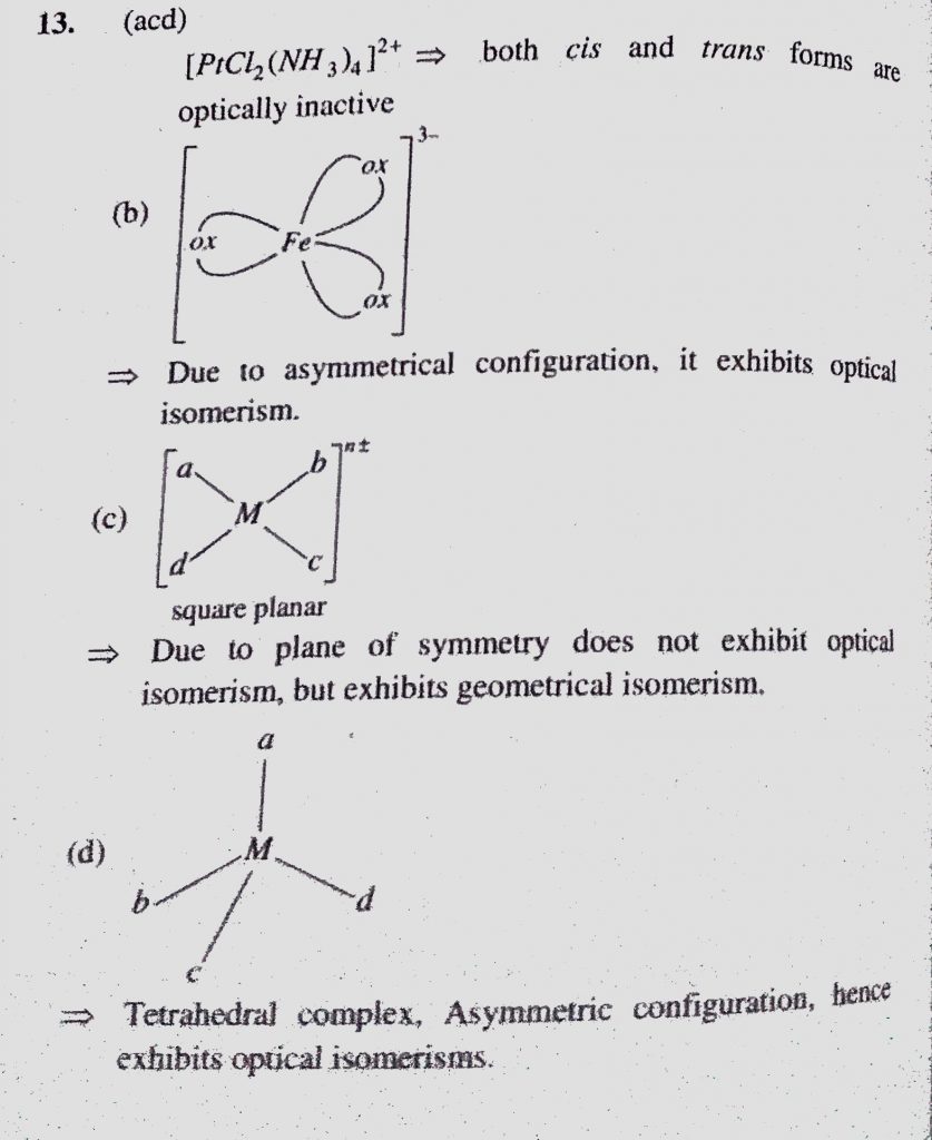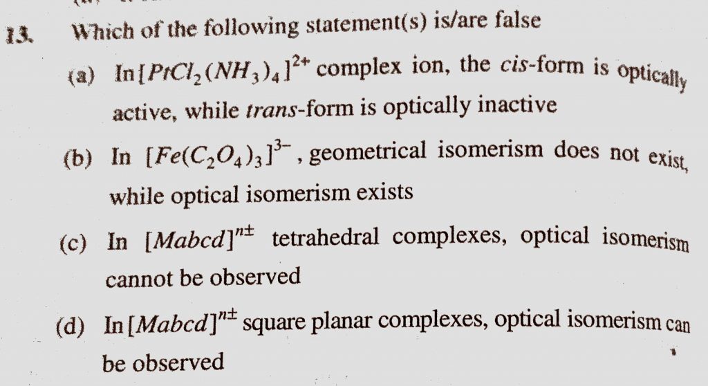 Which of the following statement(s) is/are false (a) In (PtCl2(NH3)4)2+ complex ion, the cis-form is optically active, while trans-form is optically inactive the cis-form is optically active Which of the following statement(s) is/are false (a) In (PtCl2(NH3)4)2+ complex ion while trans-form is optically inactive December 6, 2020 Category: Uncategorised (JEE Advanced Physics by BM Sharma + GMP Solutions) , Facebook Messenger WhatsApp Share this:TwitterFacebook Related