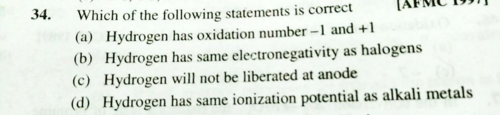 Which of the following statements is correct (a) Hydrogen has oxidation number -1 and +1 (b) Hydrogen has same electronegativity as halogens Which of the following statements is correct (a) Hydrogen has oxidation number -1 and +1 (b) Hydrogen has same electronegativity as halogens November 24, 2020 Category: Uncategorised (JEE Advanced Physics by BM Sharma + GMP Solutions) , Facebook Messenger WhatsApp Share this:TwitterFacebook Related