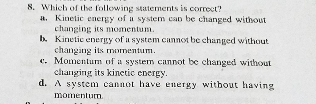 Which of the following statements is correct ? a. Kinetic energy of a system can be changed without changing its momentum. b. kinetic energy of a system cannot be changed without Which of the following statements is correct ? a. Kinetic energy of a system can be changed without changing its momentum. b. kinetic energy of a system cannot be changed without October 3, 2020 Category: Uncategorised (JEE Advanced Physics by BM Sharma + GMP Solutions) , Facebook Messenger WhatsApp Share this:TwitterFacebook Related