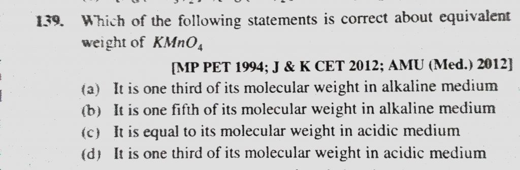 Which of the following statements is correct about equivalent weight of KMnO4 (a) It is one third of its molecular weight in alkaline medium Which of the following statements is correct about equivalent weight of KMnO4 (a) It is one third of its molecular weight in alkaline medium December 1, 2020 Category: Uncategorised (JEE Advanced Physics by BM Sharma + GMP Solutions) , Facebook Messenger WhatsApp Share this:TwitterFacebook Related