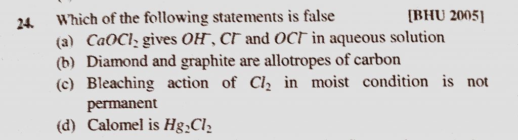 Which of the following statements is false (a) CaOCl2 gives OH-, Cl- and OCl- in aqueous solution (b) Diamond and graphite are allotropes of carbon Cl- and OCl- in aqueous solution (b) Diamond and graphite are allotropes of carbon Which of the following statements is false (a) CaOCl2 gives OH- November 15, 2020 Category: Uncategorised (JEE Advanced Physics by BM Sharma + GMP Solutions) , Facebook Messenger WhatsApp Share this:TwitterFacebook Related