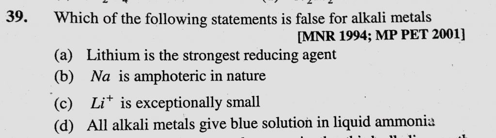 Which of the following statements is false for alkali metals (a) Lithium is the strongest reducing agent (b) Na is amphoteric in nature Which of the following statements is false for alkali metals (a) Lithium is the strongest reducing agent (b) Na is amphoteric in nature November 27, 2020 Category: Uncategorised (JEE Advanced Physics by BM Sharma + GMP Solutions) , Facebook Messenger WhatsApp Share this:TwitterFacebook Related