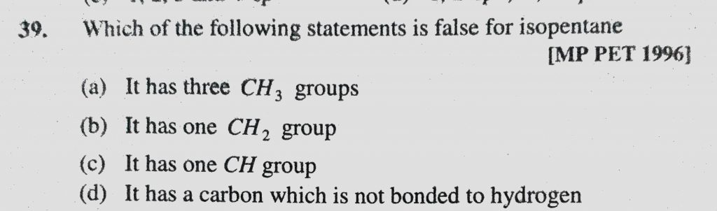 Which of the following statements is false for isopentane (a) It has three CH3 groups (b) It has one CH2 group Which of the following statements is false for isopentane (a) It has three CH3 groups (b) It has one CH2 group December 8, 2020 Category: Uncategorised (JEE Advanced Physics by BM Sharma + GMP Solutions) , Facebook Messenger WhatsApp Share this:TwitterFacebook Related