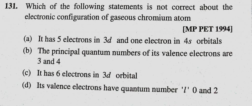 Which of the following statements is not correct about the electronic configuration of gaseous chromium atom (a) It has 5 electrons in 3d and one electron in 4s orbitals Which of the following statements is not correct about the electronic configuration of gaseous chromium atom (a) It has 5 electrons in 3d and one electron in 4s orbitals November 30, 2020 Category: Uncategorised (JEE Advanced Physics by BM Sharma + GMP Solutions) , Facebook Messenger WhatsApp Share this:TwitterFacebook Related