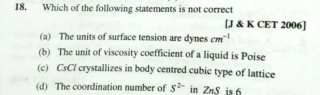 Which of the following statements is not correct (a) The units of surface tension are dynes/cm (b) The uniit of viscosity coefficient of a liquid is poise (c) CsCl crystallizes in body centred cubic type of lattice (d) The coordinationn number of S^2- in ZnS is 6