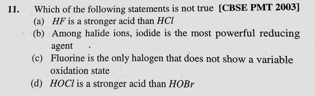 Which of the following statements is not true (a) HF is a stronger acid than HCl (b) Among halide ions, iodide is the most powerful reducing agent iodide is the most powerful reducing agent Which of the following statements is not true (a) HF is a stronger acid than HCl (b) Among halide ions November 24, 2020 Category: Uncategorised (JEE Advanced Physics by BM Sharma + GMP Solutions) , Facebook Messenger WhatsApp Share this:TwitterFacebook Related