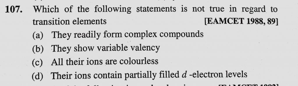Which of the following statements is not true in regard to transition elements (a) They readily form complex compounds Which of the following statements is not true in regard to transition elements (a) They readily form complex compounds November 30, 2020 Category: Uncategorised (JEE Advanced Physics by BM Sharma + GMP Solutions) , Facebook Messenger WhatsApp Share this:TwitterFacebook Related