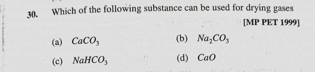 Which of the following substance can be used for drying gases (a) CaCO3 (b) Na2CO3 (c) NaHCO3 (d) CaO Which of the following substance can be used for drying gases (a) CaCO3 (b) Na2CO3 (c) NaHCO3 (d) CaO November 12, 2020 Category: Uncategorised (JEE Advanced Physics by BM Sharma + GMP Solutions) , Facebook Messenger WhatsApp Share this:TwitterFacebook Related