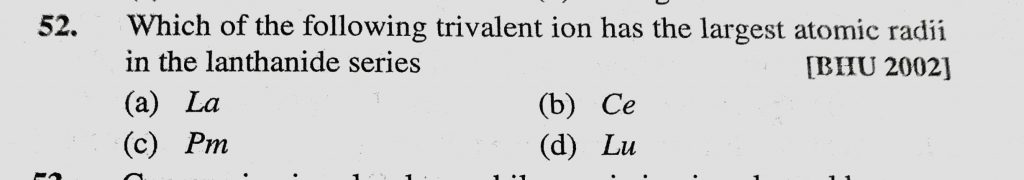 Which of the following trivalent ion has the largest atomic radii in the lanthanide series (a) La (b) Ce (c) Pm (d) Lu Which of the following trivalent ion has the largest atomic radii in the lanthanide series (a) La (b) Ce (c) Pm (d) Lu November 29, 2020 Category: Uncategorised (JEE Advanced Physics by BM Sharma + GMP Solutions) , Facebook Messenger WhatsApp Share this:TwitterFacebook Related
