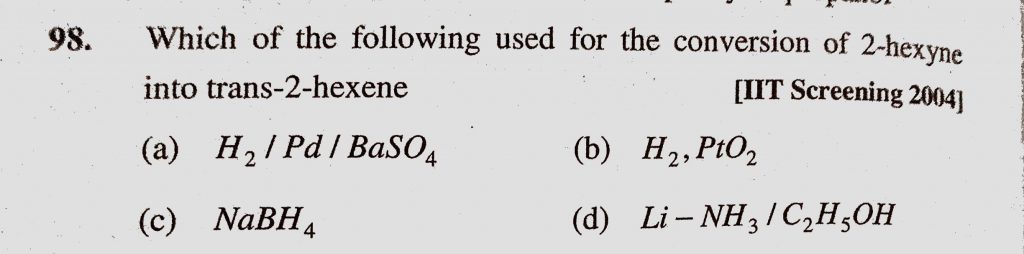 Which of the following used for the conversion of 2-hexyne into trans-2-hexene (a) H2 / Pd / BaSO4 (b) H2, PtO2 (c) NaBH4 (d) Li-NH3/ CH2H5OH PtO2 (c) NaBH4 (d) Li-NH3/ CH2H5OH Which of the following used for the conversion of 2-hexyne into trans-2-hexene (a) H2 / Pd / BaSO4 (b) H2 December 16, 2020 Category: Uncategorised (JEE Advanced Physics by BM Sharma + GMP Solutions) , Facebook Messenger WhatsApp Share this:TwitterFacebook Related