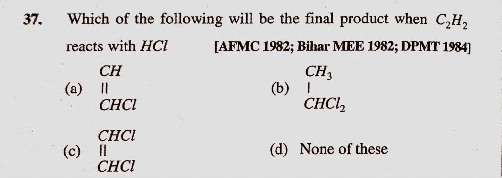 Which of the following will be final product when C2H2 reacts with HCl Which of the following will be final product when C2H2 reacts with HCl December 14, 2020 Category: Uncategorised (JEE Advanced Physics by BM Sharma + GMP Solutions) , Facebook Messenger WhatsApp Share this:TwitterFacebook Related