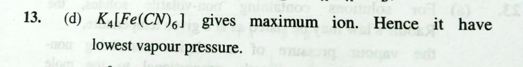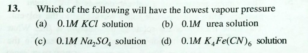 Which of the following will have the lowest vapour pressure (a) 0.1 M kCL solution (b) 0.1 M urea solution (C) 0. 1 M NaSO4 solution (d) 0.1 M K4 Fe( CN) 6 solution Which of the following will have the lowest vapour pressure (a) 0.1 M kCL solution (b) 0.1 M urea solution (C) 0. 1 M NaSO4 solution (d) 0.1 M K4 Fe( CN) 6 solution December 12, 2020 Category: Uncategorised (JEE Advanced Physics by BM Sharma + GMP Solutions) , Facebook Messenger WhatsApp Share this:TwitterFacebook Related