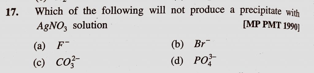 Which of the following will not produce a precipitate with AgNO3 solution (a) F- (b) Br- (c) CO3 2- (d) PO4 3- Which of the following will not produce a precipitate with AgNO3 solution (a) F- (b) Br- (c) CO3 2- (d) PO4 3- December 6, 2020 Category: Uncategorised (JEE Advanced Physics by BM Sharma + GMP Solutions) , Facebook Messenger WhatsApp Share this:TwitterFacebook Related