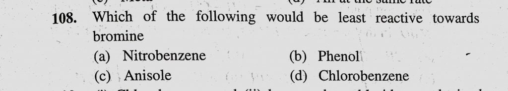 Which of the following would be least reactive towards bromine (a) Nitrobenzene (b) Phenol (c) Anisole (d) Chlorobenzene Which of the following would be least reactive towards bromine (a) Nitrobenzene (b) Phenol (c) Anisole (d) Chlorobenzene December 15, 2020 Category: Uncategorised (JEE Advanced Physics by BM Sharma + GMP Solutions) , Facebook Messenger WhatsApp Share this:TwitterFacebook Related