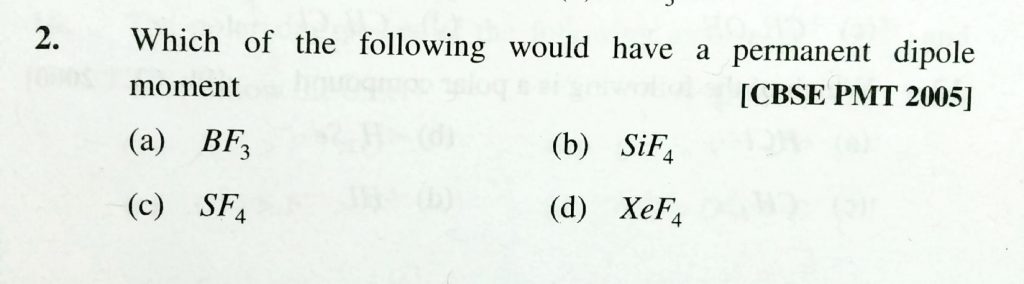 Which of the following would have a permanent dipole moment (a) BF3 (b) SiF4 (c) SF4 (d) XeF4 Which of the following would have a permanent dipole moment (a) BF3 (b) SiF4 (c) SF4 (d) XeF4 December 2, 2020 Category: Uncategorised (JEE Advanced Physics by BM Sharma + GMP Solutions) , Facebook Messenger WhatsApp Share this:TwitterFacebook Related