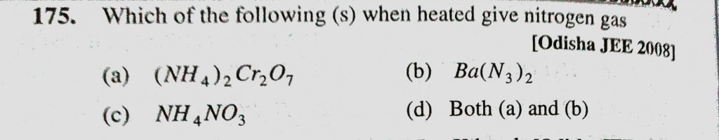 Which of the following(s) when heated give nitrogen gas (a) (NH4)2Cr2O7 (b) Ba(N3)2 (c) NH4NO3 (d) Both (a) and (b) Which of the following(s) when heated give nitrogen gas (a) (NH4)2Cr2O7 (b) Ba(N3)2 (c) NH4NO3 (d) Both (a) and (b) November 23, 2020 Category: Uncategorised (JEE Advanced Physics by BM Sharma + GMP Solutions) , Facebook Messenger WhatsApp Share this:TwitterFacebook Related