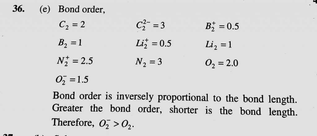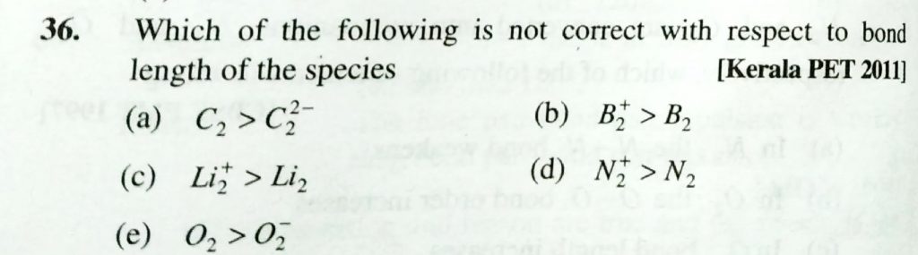 Which of the follwing is not correct with respect to bond length species (a) C2 > C2^2- (b) B2^+ > B2 (c) Li2^+ > Li2 (d) N2^+ > N2 (e) O2 > O2 ^- Which of the follwing is not correct with respect to bond length species (a) C2 > C2^2- (b) B2^+ > B2 (c) Li2^+ > Li2 (d) N2^+ > N2 (e) O2 > O2 ^- December 8, 2020 Category: Uncategorised (JEE Advanced Physics by BM Sharma + GMP Solutions) , Facebook Messenger WhatsApp Share this:TwitterFacebook Related