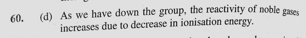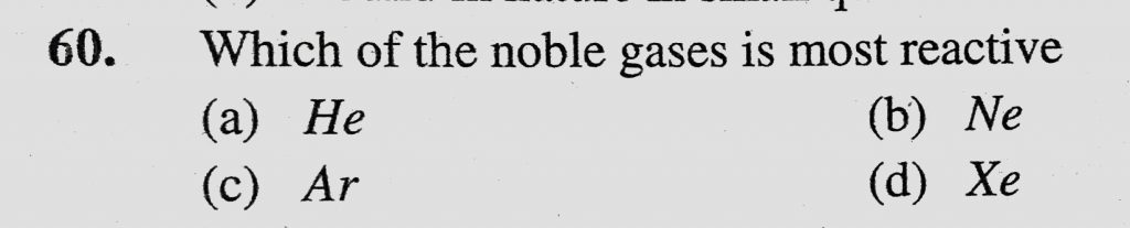 Which of the noble gases is most reactive (a) He (b) Ne (c) Ar (d) Xe Which of the noble gases is most reactive (a) He (b) Ne (c) Ar (d) Xe November 25, 2020 Category: Uncategorised (JEE Advanced Physics by BM Sharma + GMP Solutions) , Facebook Messenger WhatsApp Share this:TwitterFacebook Related