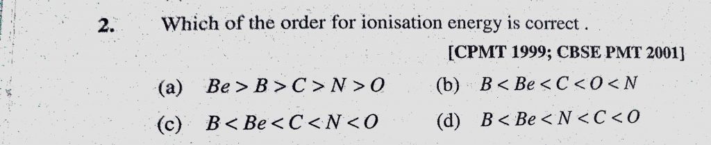 Which of the order for ionisation energy is correct. (a) Be > B > C > N > O (b) B < Be < C < O < N (c) B < Be < C < N < O (d) B < Be < N < C < O Which of the order for ionisation energy is correct. (a) Be > B > C > N > O (b) B < Be < C < O < N (c) B < Be < C < N < O (d) B < Be < N < C < O November 9, 2020 Category: Uncategorised (JEE Advanced Physics by BM Sharma + GMP Solutions) , Facebook Messenger WhatsApp Share this:TwitterFacebook Related