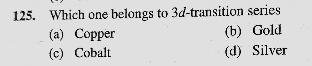 Which one belongs to 3d-transition series (a) Copper (b) Gold (c) Cobalt (d) Silver Which one belongs to 3d-transition series (a) Copper (b) Gold (c) Cobalt (d) Silver November 30, 2020 Category: Uncategorised (JEE Advanced Physics by BM Sharma + GMP Solutions) , Facebook Messenger WhatsApp Share this:TwitterFacebook Related