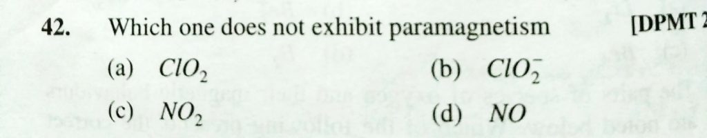 Which one does not exhibit paramagnetism (a) CLO2 (b) CLO2^- (c) NO2 (d) NO Which one does not exhibit paramagnetism (a) CLO2 (b) CLO2^- (c) NO2 (d) NO December 8, 2020 Category: Uncategorised (JEE Advanced Physics by BM Sharma + GMP Solutions) , Facebook Messenger WhatsApp Share this:TwitterFacebook Related