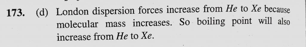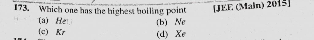 Which one has the highest boiling point (a) He (b) Ne (c) Kr (d) Xe Which one has the highest boiling point (a) He (b) Ne (c) Kr (d) Xe November 28, 2020 Category: Uncategorised (JEE Advanced Physics by BM Sharma + GMP Solutions) , Facebook Messenger WhatsApp Share this:TwitterFacebook Related