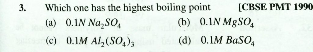 Which one has the highest boiling point (a)n 0.1 N Na2SO4 (b) 0.1 N MgSO4 (c) 0.1 M Al2 (SO4 )3 (d) 0.1 M BaSO4 Which one has the highest boiling point (a)n 0.1 N Na2SO4 (b) 0.1 N MgSO4 (c) 0.1 M Al2 (SO4 )3 (d) 0.1 M BaSO4 December 13, 2020 Category: Uncategorised (JEE Advanced Physics by BM Sharma + GMP Solutions) , Facebook Messenger WhatsApp Share this:TwitterFacebook Related