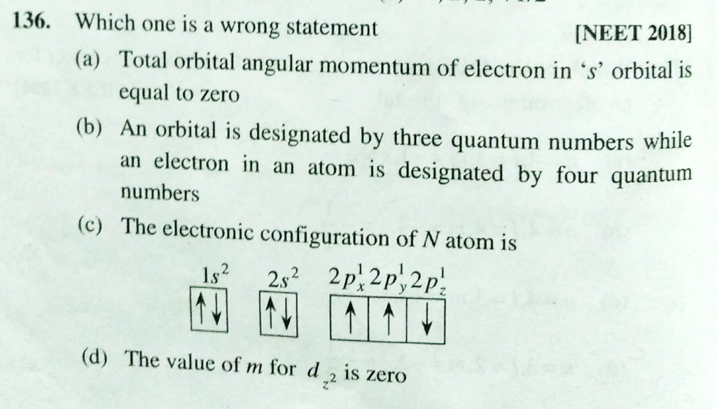 Which one is a wrong statement (a) Total orbital anular momentum of electron in ‘s’ orbital is equal to zero (b) An orbital is designated by three quantum numbers while an electron in an atom designated by four quantum numbers. ground state electron of which one of the following atoms l = 0 m = 0 and s = +1/2 correspond to the most loosely bound The set of quantum numbers n = 4 November 29, 2020 Category: Uncategorised (JEE Advanced Physics by BM Sharma + GMP Solutions) , Facebook Messenger WhatsApp Share this:TwitterFacebook Related