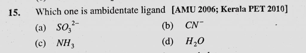 Which one is ambidentate ligand (a) SO3 2- (b) CN- (c) NH3 (d) H2O Which one is ambidentate ligand (a) SO3 2- (b) CN- (c) NH3 (d) H2O December 3, 2020 Category: Uncategorised (JEE Advanced Physics by BM Sharma + GMP Solutions) , Facebook Messenger WhatsApp Share this:TwitterFacebook Related
