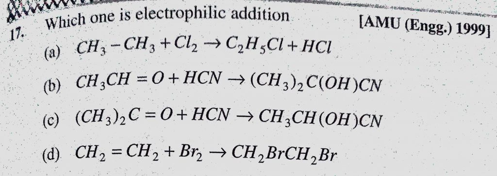 Which one is electrophilic addition (a) CH3-CH3+Cl2 to C2H5Cl + HCl Which one is electrophilic addition (a) CH3-CH3+Cl2 to C2H5Cl + HCl December 11, 2020 Category: Uncategorised (JEE Advanced Physics by BM Sharma + GMP Solutions) , Facebook Messenger WhatsApp Share this:TwitterFacebook Related