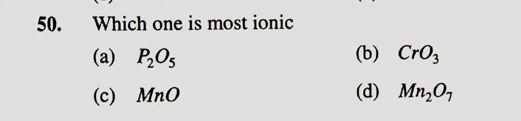 Which one is most ionic (a) P2O5 (b) CrO3 (c) MnO (d) Mn2O7 Which one is most ionic (a) P2O5 (b) CrO3 (c) MnO (d) Mn2O7 December 9, 2020 Category: Uncategorised (JEE Advanced Physics by BM Sharma + GMP Solutions) , Facebook Messenger WhatsApp Share this:TwitterFacebook Related