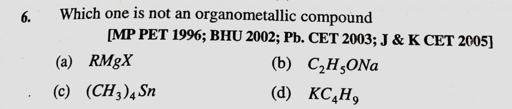 Which one is not an organometallic compound (a) RMgX (b) C2H5ONa (c) (CH3)4 Sn Which one is not an organometallic compound (a) RMgX (b) C2H5ONa (c) (CH3)4 Sn December 5, 2020 Category: Uncategorised (JEE Advanced Physics by BM Sharma + GMP Solutions) , Facebook Messenger WhatsApp Share this:TwitterFacebook Related