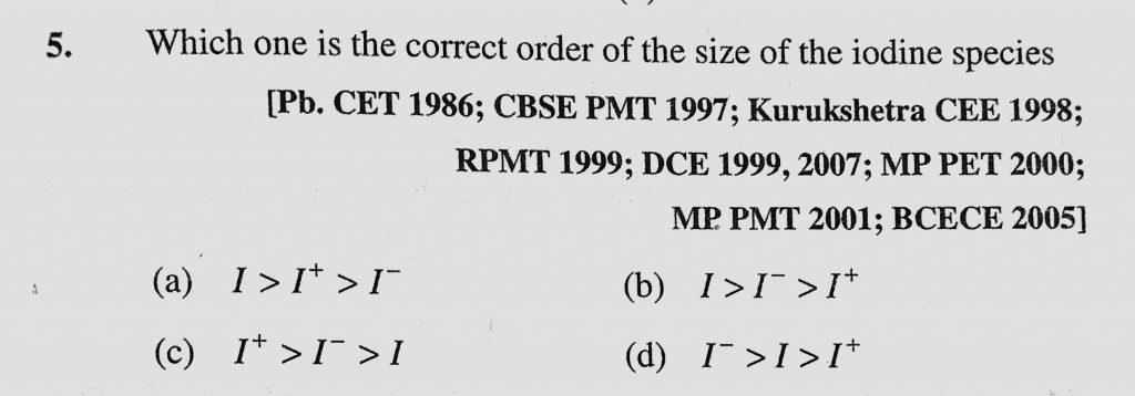 Which one is the correct order of the size of the iodine species (a) I > I + > I- (b) I > I – > I+ Which one is the correct order of the size of the iodine species (a) I > I + > I- (b) I > I - > I+ November 9, 2020 Category: Uncategorised (JEE Advanced Physics by BM Sharma + GMP Solutions) , Facebook Messenger WhatsApp Share this:TwitterFacebook Related