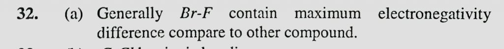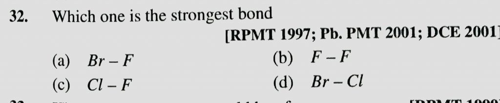 Which one is the strongest bond (a) Br – F (b) F – F (c) Cl – F (d) Br – Cl Which one is the strongest bond (a) Br - F (b) F - F (c) Cl - F (d) Br - Cl December 1, 2020 Category: Uncategorised (JEE Advanced Physics by BM Sharma + GMP Solutions) , Facebook Messenger WhatsApp Share this:TwitterFacebook Related