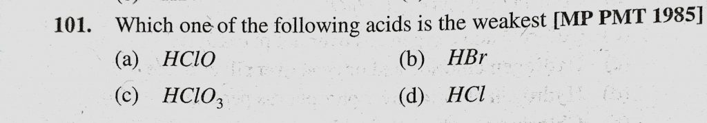 Which one of the following acids is the weakest (a) HClO (b) HBr (c) HClO3 (d) HCl Which one of the following acids is the weakest (a) HClO (b) HBr (c) HClO3 (d) HCl November 24, 2020 Category: Uncategorised (JEE Advanced Physics by BM Sharma + GMP Solutions) , Facebook Messenger WhatsApp Share this:TwitterFacebook Related