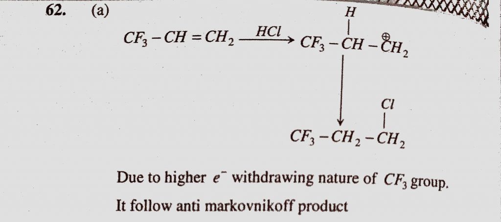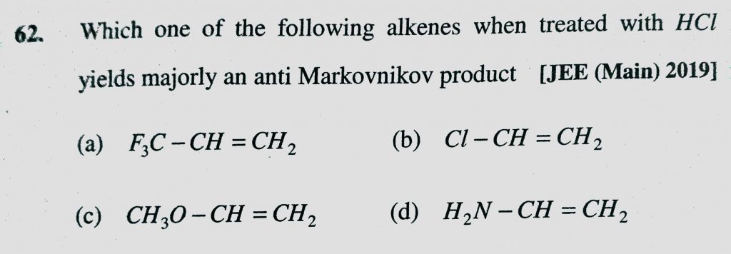 Which one of the following alkenes when treated with HCl yields majorly an anti Markovnikov product (a) F3C – CH = CH2 (b) Cl – CH = CH2 (c) CH3O – CH =CH2 Which one of the following alkenes when treated with HCl yields majorly an anti Markovnikov product (a) F3C - CH = CH2 (b) Cl - CH = CH2 (c) CH3O - CH =CH2 February 9, 2021 Category: Uncategorised (JEE Advanced Physics by BM Sharma + GMP Solutions) , Facebook Messenger WhatsApp Share this:TwitterFacebook Related
