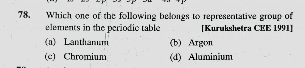 Which one of the following belongs to representative group of elements in the periodic table (a)Lanthanum (b)Argon (c) Chromium (d) Aluminium Which one of the following belongs to representative group of elements in the periodic table (a)Lanthanum (b)Argon (c) Chromium (d) Aluminium November 9, 2020 Category: Uncategorised (JEE Advanced Physics by BM Sharma + GMP Solutions) , Facebook Messenger WhatsApp Share this:TwitterFacebook Related