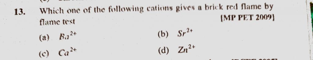 Which one of the following cations gives a brick red flame by flame test (a) Ba 2+ (b) Sr 2+ (c) Ca 2+ (d) Zn 2+ Which one of the following cations gives a brick red flame by flame test (a) Ba 2+ (b) Sr 2+ (c) Ca 2+ (d) Zn 2+ December 6, 2020 Category: Uncategorised (JEE Advanced Physics by BM Sharma + GMP Solutions) , Facebook Messenger WhatsApp Share this:TwitterFacebook Related