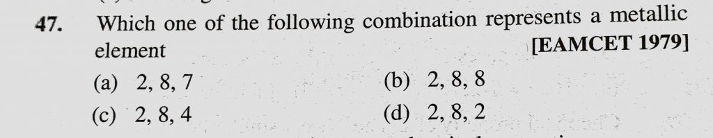 Which one of the following combination represents a metallic element Which one of the following combination represents a metallic element November 8, 2020 Category: Uncategorised (JEE Advanced Physics by BM Sharma + GMP Solutions) , Facebook Messenger WhatsApp Share this:TwitterFacebook Related