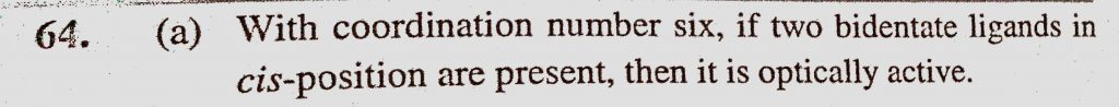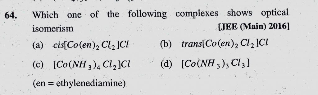 Which one of the following complexes shows optical isomerism (a) cis(Co(en)2Cl2)Cl (b) trans(Co(en)2Cl2)Cl Which one of the following complexes shows optical isomerism (a) cis(Co(en)2Cl2)Cl (b) trans(Co(en)2Cl2)Cl December 5, 2020 Category: Uncategorised (JEE Advanced Physics by BM Sharma + GMP Solutions) , Facebook Messenger WhatsApp Share this:TwitterFacebook Related